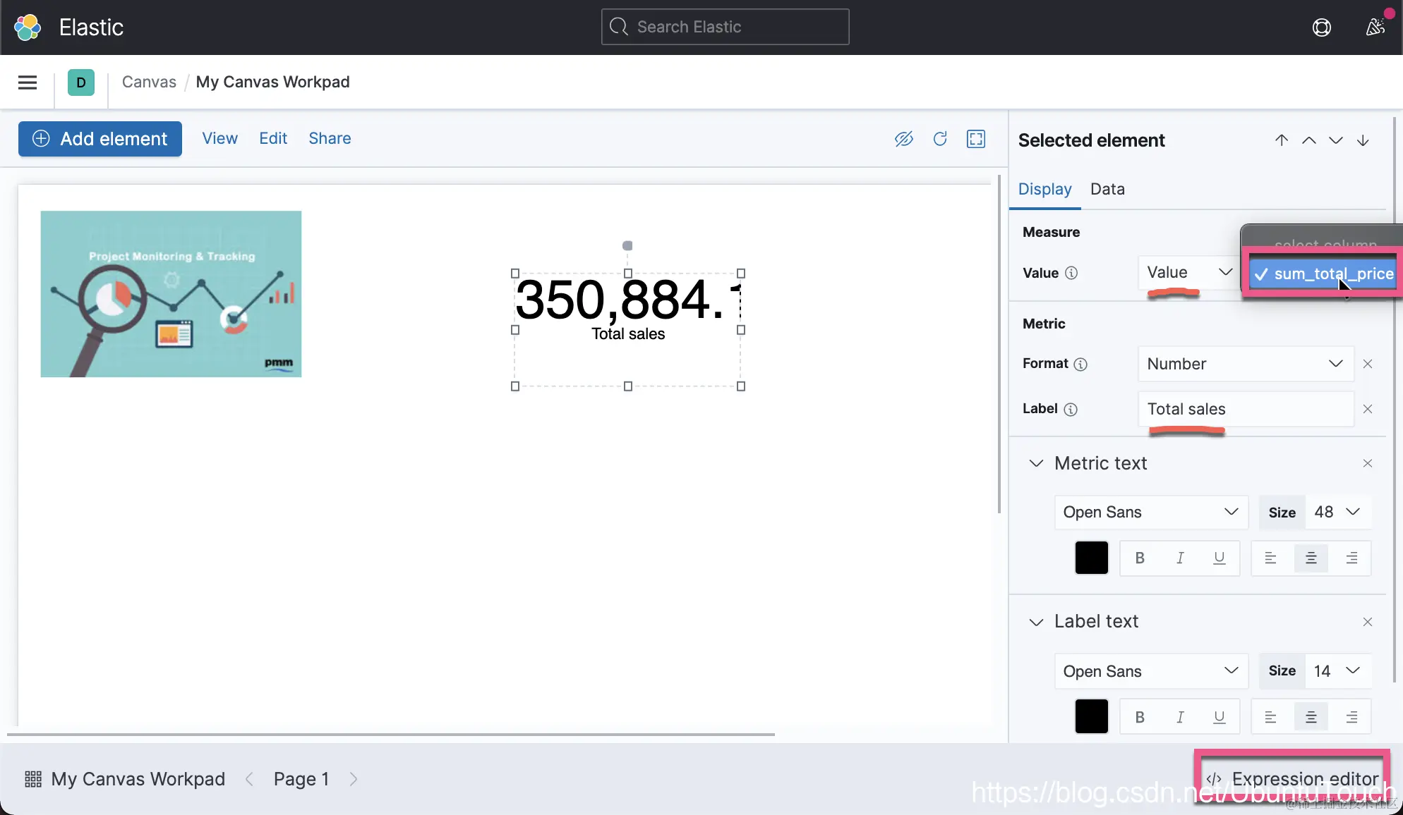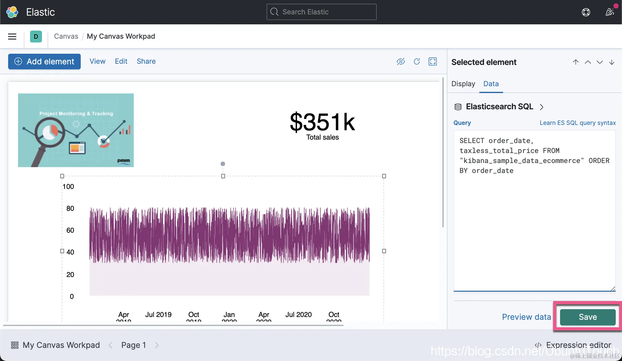 点击上面的 Save 按钮。查询选择总价格字段并将其设置为 sum_total_price 字段。 所有字段均从 kibana_sample_data_ecommerce 索引中提取。