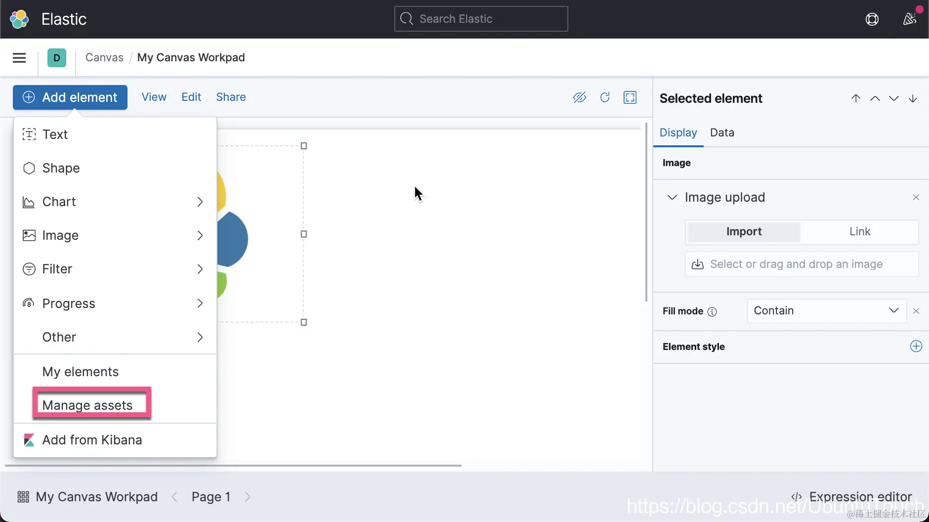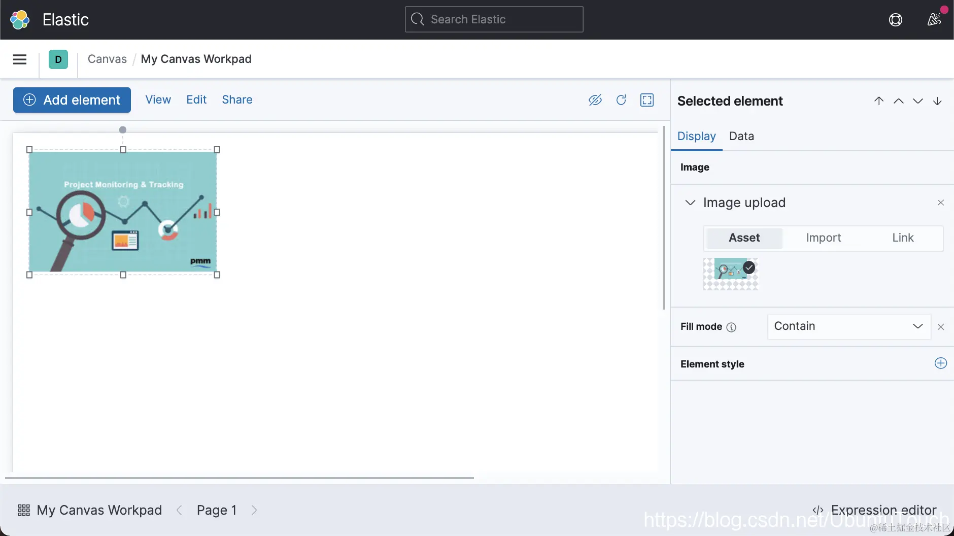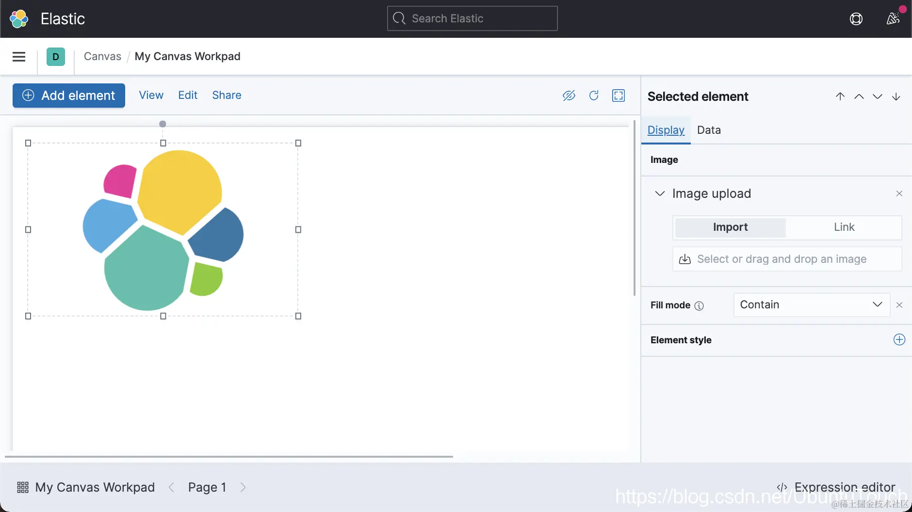 首先,我们想添加一个属于自己的图片。点击上面的 Add element > Image > Image: