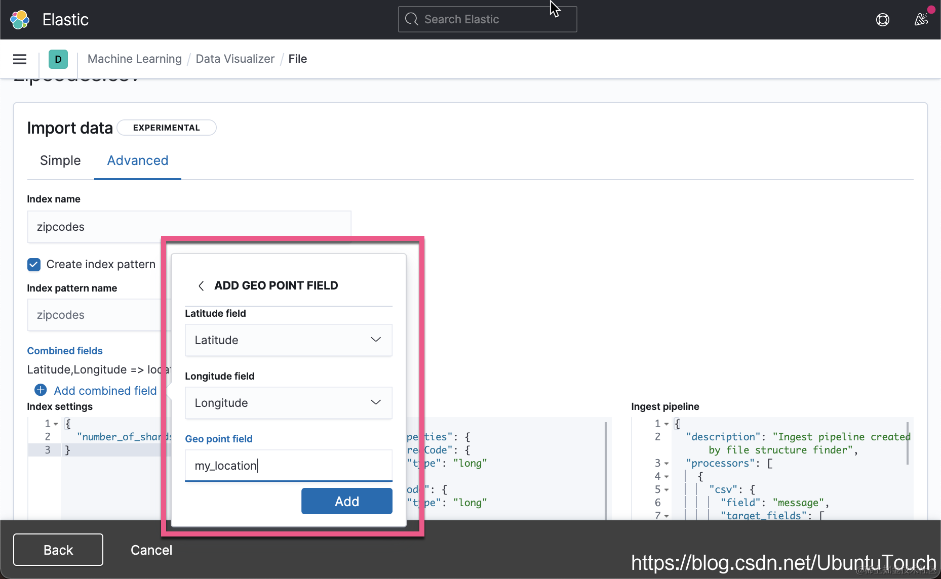 在上面我们可以清楚地看到:Latitude 以及 Logitude 被自动组合成为一个新的 geo_point 的数据类型。这个在之前的版本中是没有这个功能的。我们点击 Advanced: