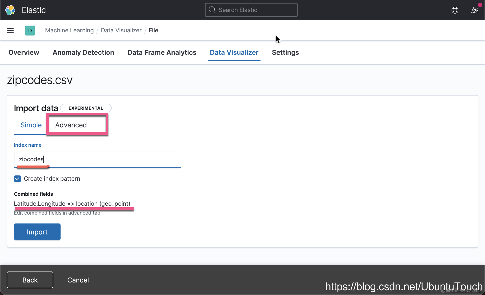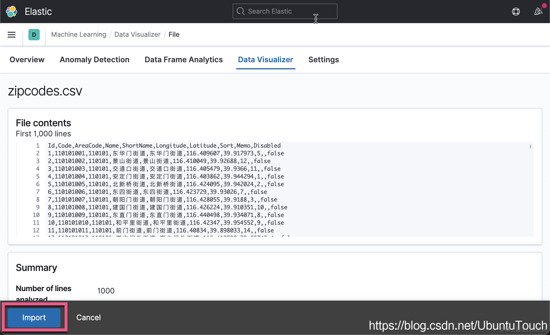 如上图所示,经过我们的这番操作,我们可以看到有两个位置信息字段 location 已经 my_location。当然这个是为了说明问题,在实际的使用中,我们只需要一个位置信息字段即可。我们点击 Import 按钮。这样就完成了数据的导入。