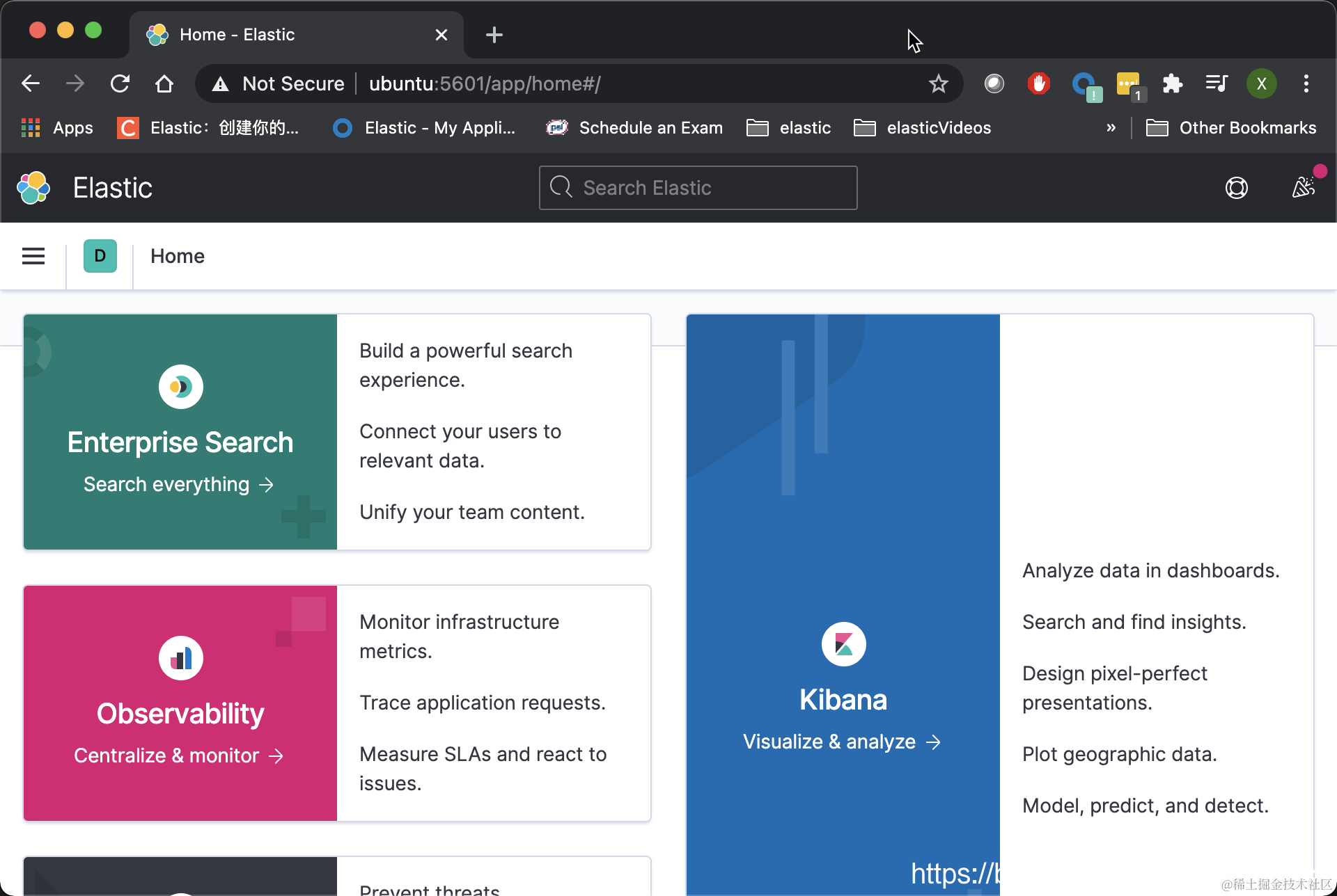 上面的输出结果显示我们的安装是成功的。我们在 MacOS 的浏览器中打入如下的地址 ubuntu:5601。