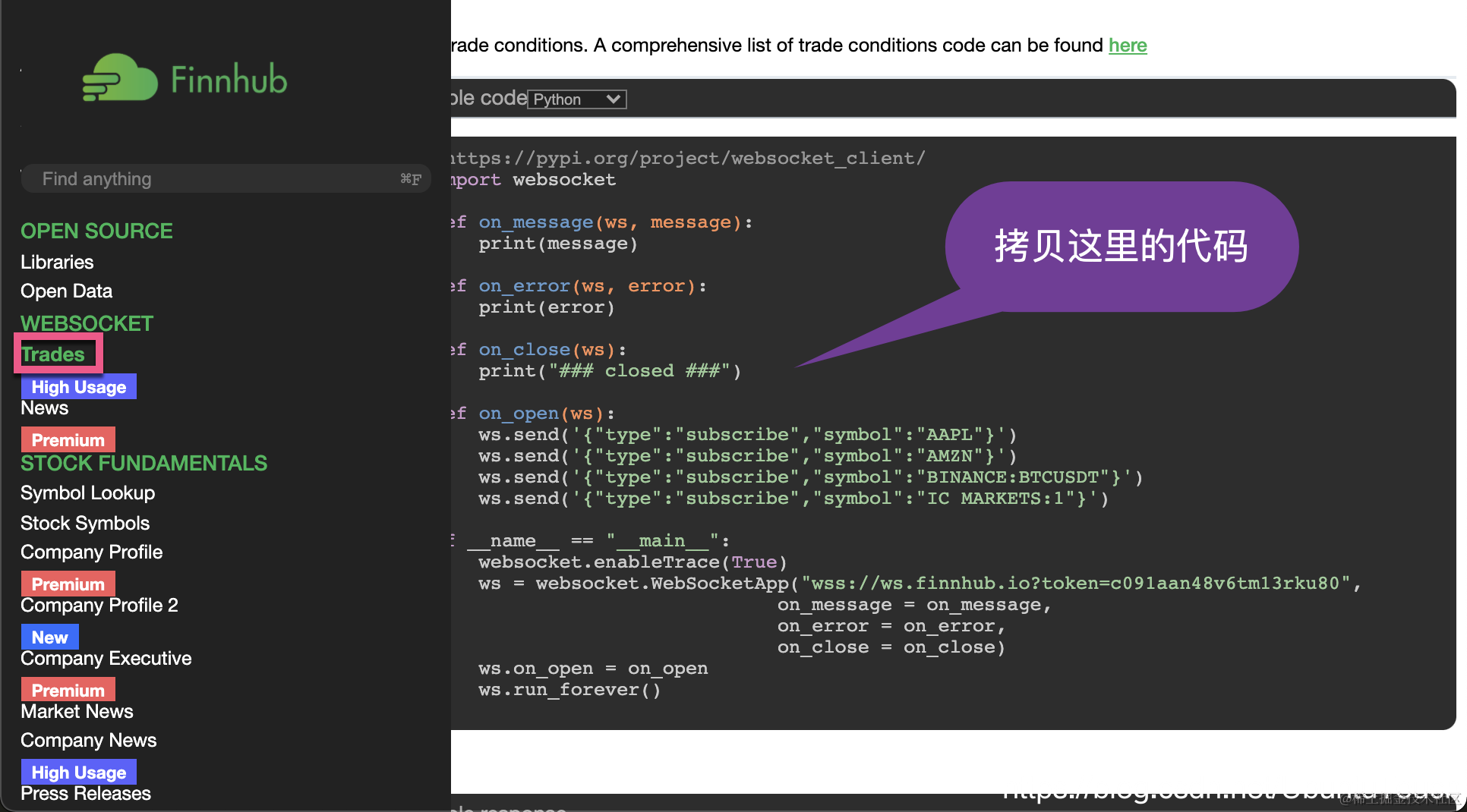 在左边我们点击 Trades,然后拷贝自己的代码并保存到本地文件 finnhub-websockets.py 中: