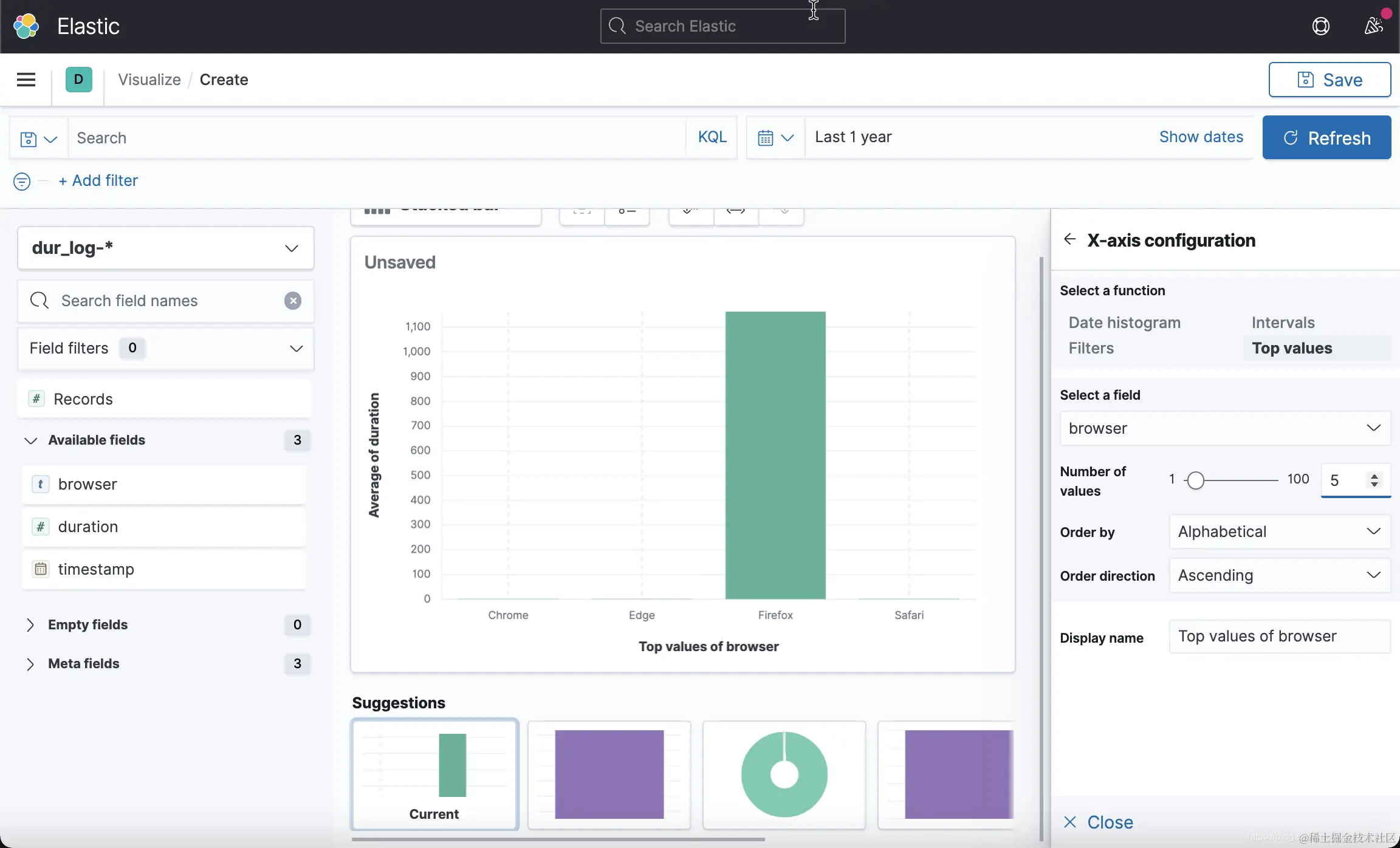 从上面,我们可以看出来,Firefox 的值比其它的浏览器的值显然高的太多了。明显显示它的单位是不对的。那么我们如何修改这个错误呢,一种办法是我们重新修改我们的数据源,并把 Firefox 的 duration 的值除以 1000,并重新导入,或者使用 ingest pipeline 在导入的过程中进行处理。那么有没有一种办法在不重新导入的情况下能展示正确的数据呢?