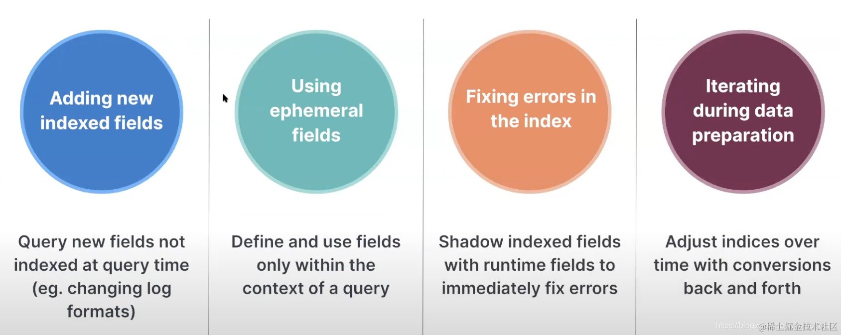 我们知道在动态 mapping 启动后,一个索引的字段可能会随着导入文档字段数的增加而自动增加,在有些情况下会发生 “映射爆炸”,也就是说字段数超过我们容忍的范围,而且另外一个坏处是,随着字段的增加,导入的速度会变慢,这是因为更多的字段需要被分词。更多被分词的字段意味着更多的磁盘空间。这种情况在很多的情况下是不允许的。在这种情况下,我们可以动态创建 runtime fields。这个方法的好处是:我们可以针对喜欢的字段在 mapping 中进行定义,而对于那么不那么重要的字段可以建立 runtime fields,虽然他们被搜索的速度会有所影响。为了平衡搜索效果和灵活性,你通常会搜索并过滤索引字段,例如时间戳。运行查询时,Elasticsearch 首先自动使用这些索引字段,从而缩短了响应时间。然后,你可以使用 runtime fields 来限制 Elasticsearch 计算其值所需的字段数。将索引字段与 runtime fields 一起使用可为你索引的数据以及如何定义其他字段的查询提供灵活性。