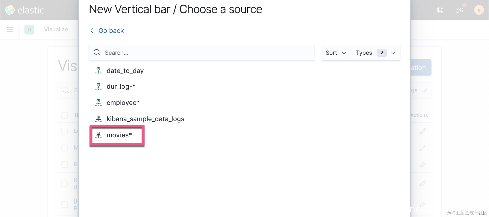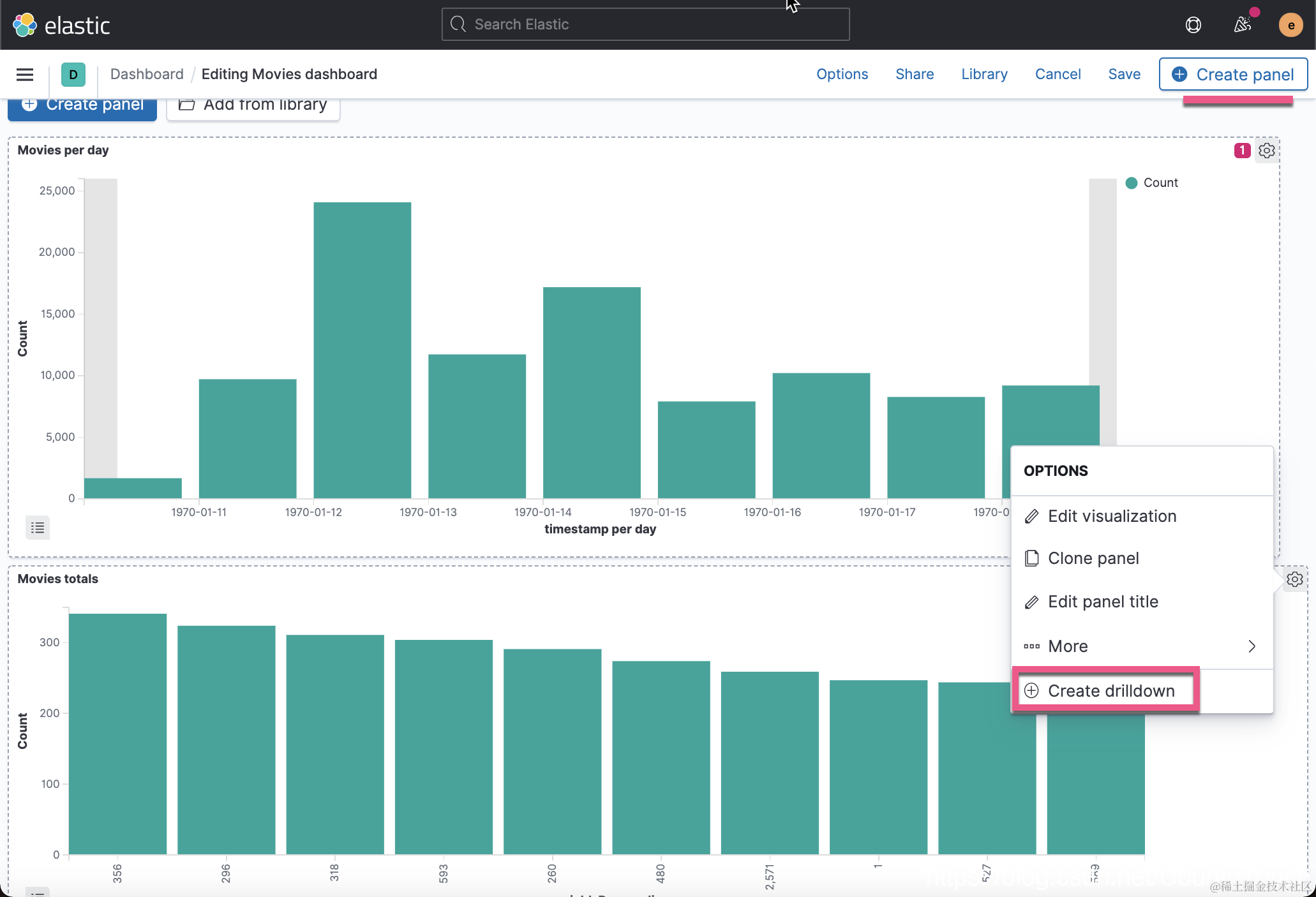 在很多的情况下,我们可能想要对 X 轴的内容进行 drilldown,那么我们该如何来实现呢?我们针对 Movies totals 可视化来创建一个 drilldown: