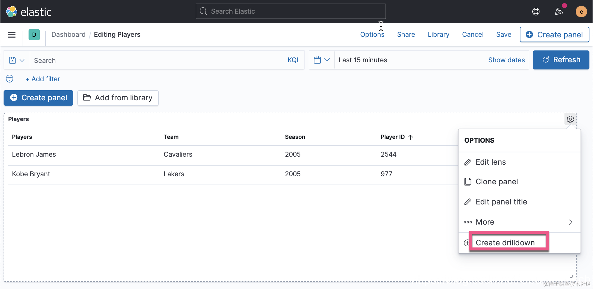 在上面,我们使用 lowercase 把点击的值变为小写,以传入 NBA 的网页中进行查询。点击 Create drilldown: