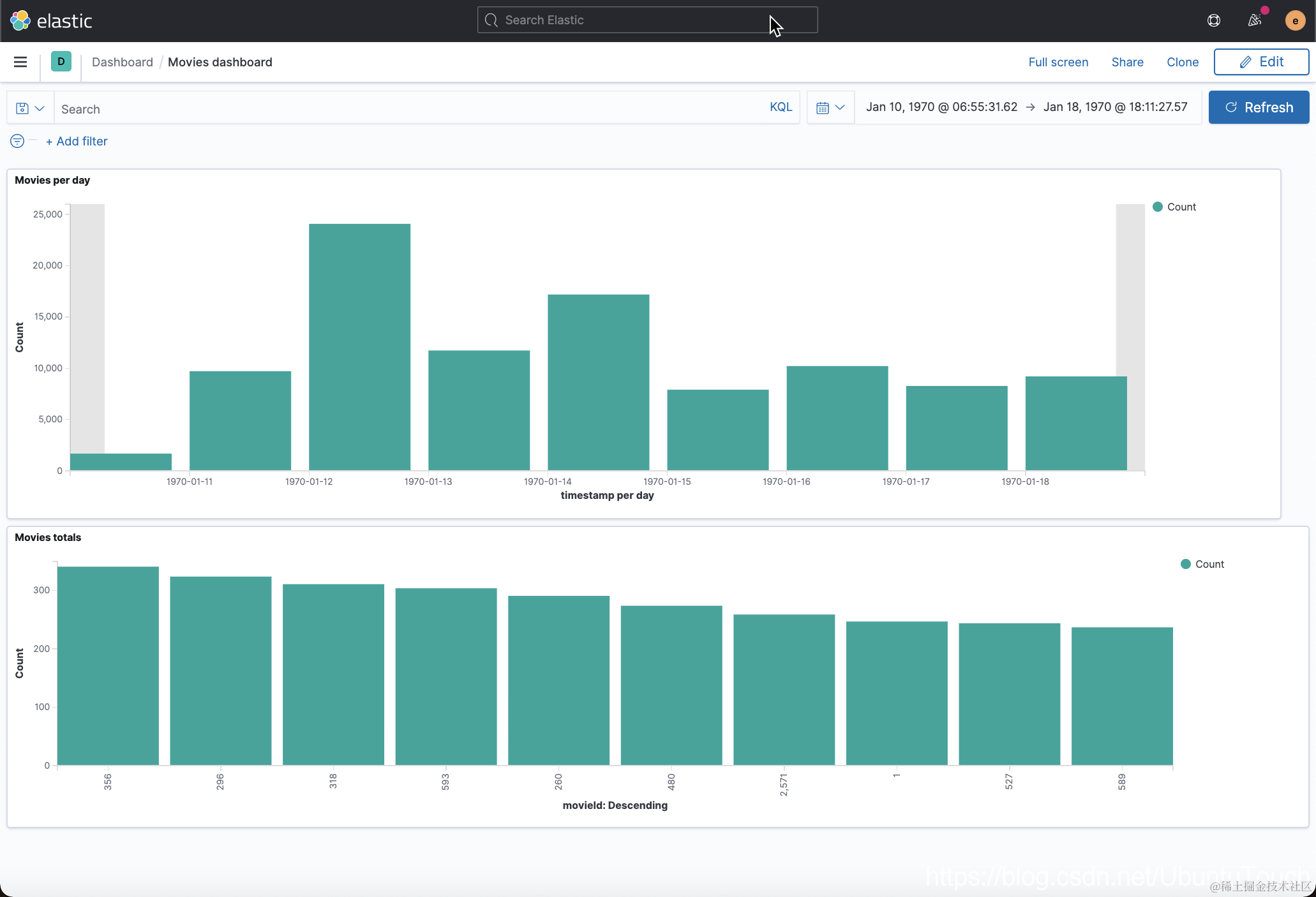 我们把上面的两个可视化放到我们的 movies Dashboard 中去: