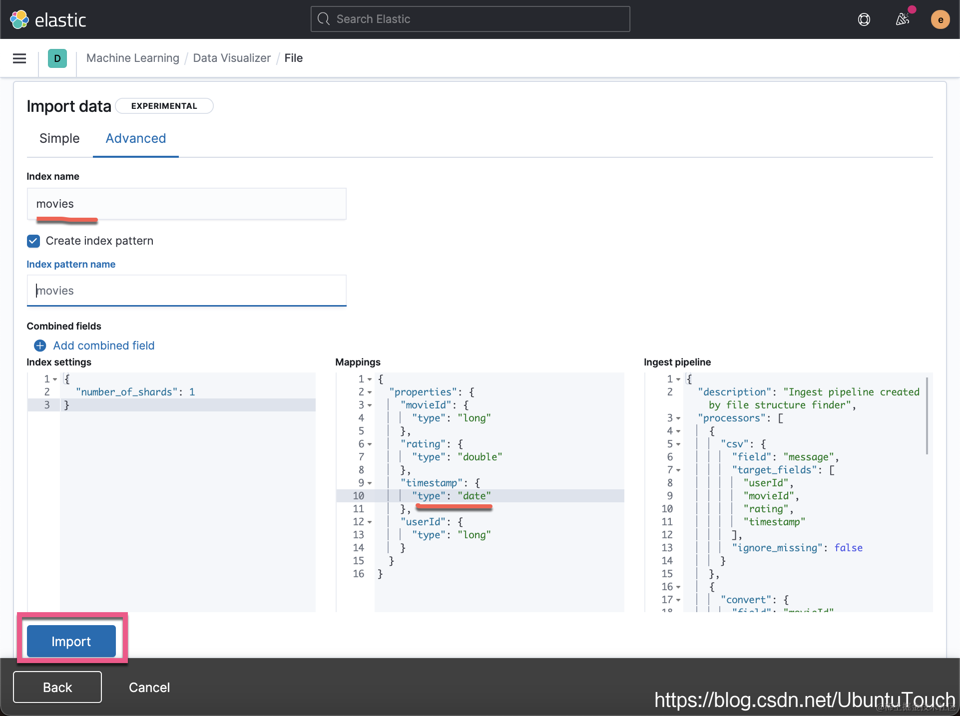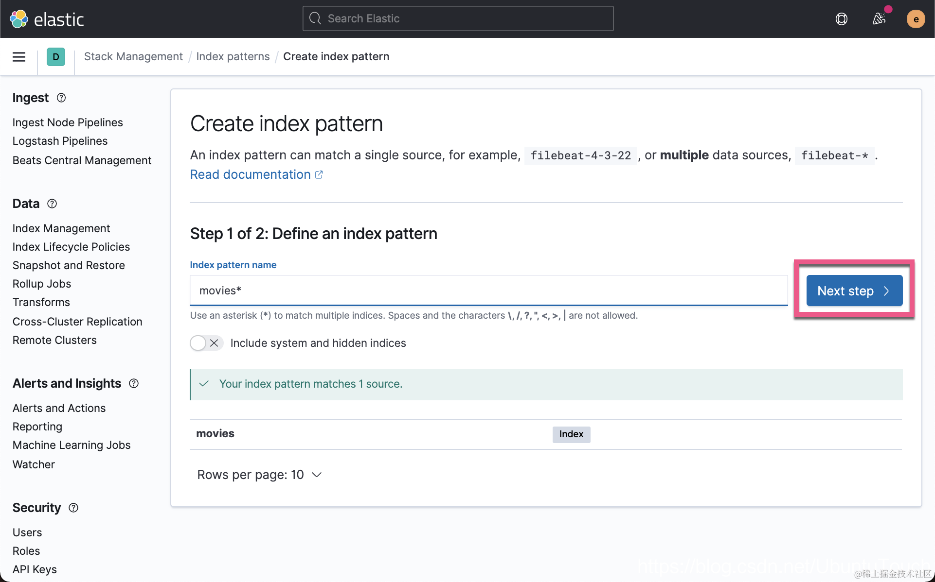 请注意在上面,我们需要修改 timestamp 的 type 为 date。我们点击 Import 按钮。我们接下来为 movies 索引创建一个 index pattern: