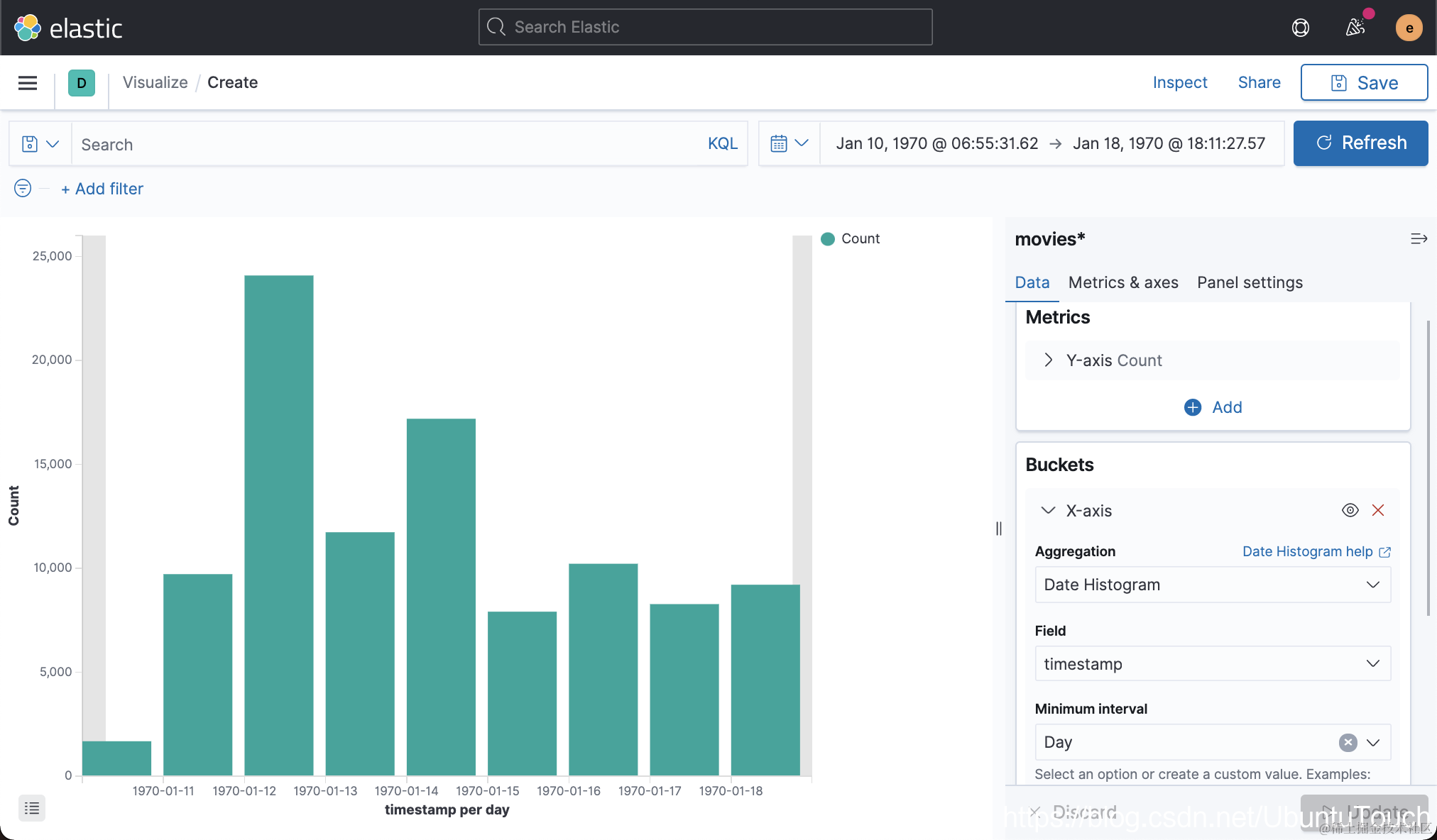 在上面的第一个可视化中,我们想针对可视化的时间范围来进行 drilldown,也就是说我们想针对 imdb 在可视化显示的时间段里进行搜索。我们可以通过如下的方法来进行操作。
