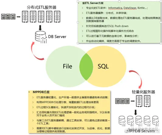 依托 GaussDB(DWS)数据库构建 ETL 系统一般有两种实现方式:重 ETLServer 方案和 MPPDB 方案。如下图