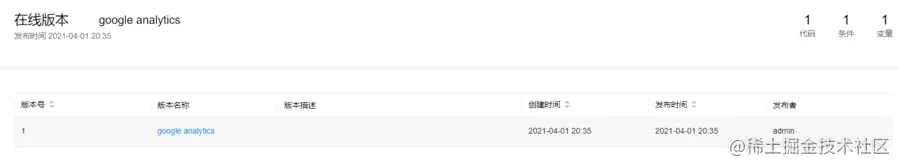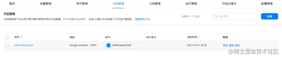 变量和条件配置完成后,接下来在代码管理中新建Google Analytics代码。配置如下: