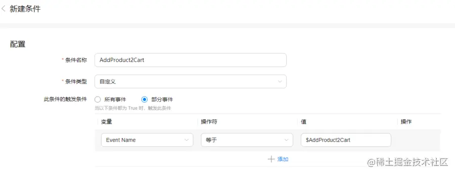 在条件管理中点击“新建”,条件类型选择“自定义”,此条件的触发条件选择“部分事件”,变量选择“Event Name”,操作符选择“等于”,值设置为“$AddProduct2Cart”。
