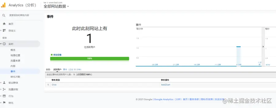 如上图所示,在导航栏中的“实时”->“事件”里面,查看最近上报的数据。可以看到上报的事件中,事件类别为“Click”,事件操作为“Add2Cart”,与DTM中的配置一致,说明DTM中的配置可以生效。