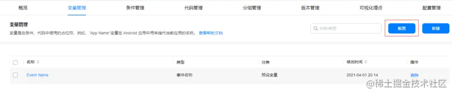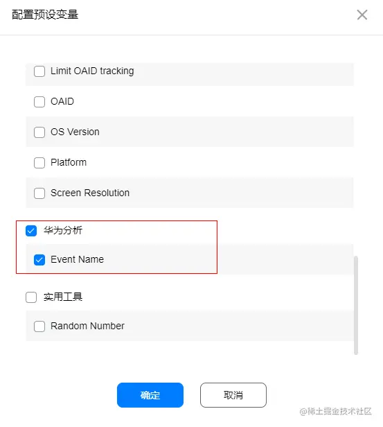 在变量管理中点击“配置”,选择Event Name,点击“确定”即可添加成功。