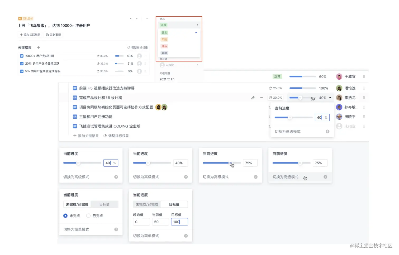 在跟进阶段,以 CODING 为例,员工会以周会形式,围绕 OKR 的进度、问题与风险、优先级权重,与团队、直属领导对齐;管理层则以月为周期,以会议方式,对管理层的 OKR 进度进行追踪。