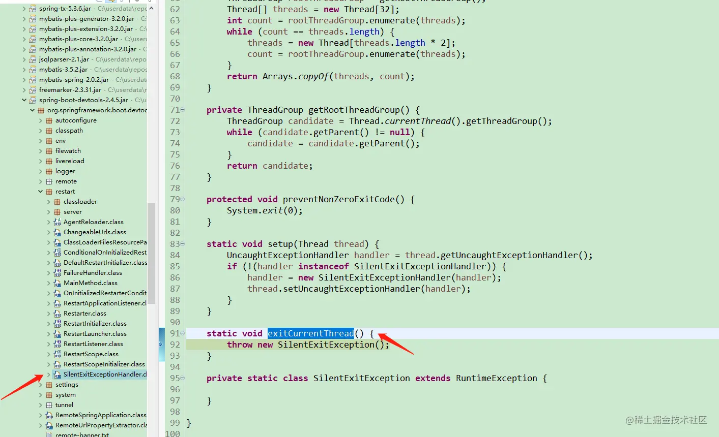 记:解决Debug启动Spring Boot项目时自动跳转到exitCurrentThread 码在指尖舞 2021-05-08 451 阅读1分钟 问题描述: 在Eclipse中Debug启动Spring Boot项目时,会自动跳转exitCurrentThread方法,如图 static void exitCurrentThread() { throw new SilentExitException(); } 解决方法: Eclipse->【Preferences】->【Java】->【Debug】:去掉【Suspend execution on uncaught exceptions】前面的勾。