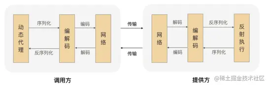 项目可以分为调用方(client)和提供方(server),client 端只需要调用接口即可,最终调用信息会通过网络传输到 server,server 通过解码后反射调用对应的方法,并将结果通过网络返回给 client。对于 client 端可以完全忽略网络的存在,就像调用本地方法一样调用 rpc 服务。