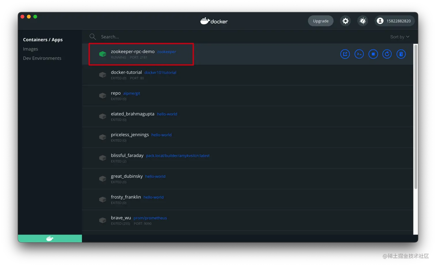 启动命令如下,容器的名称是zookeeper-rpc-demo,同时向本机暴露 8080、2181、2888 和 3888 端口: