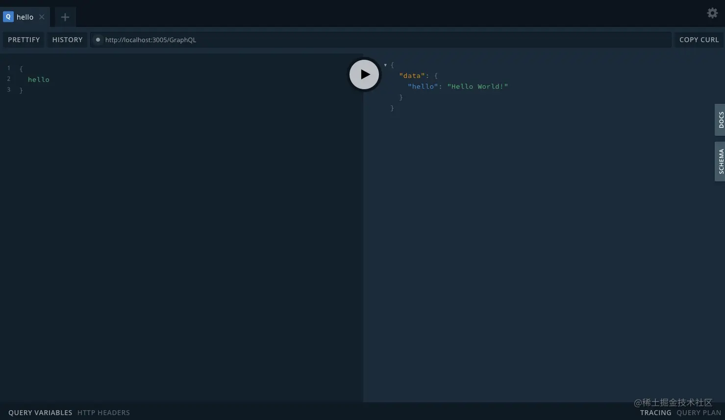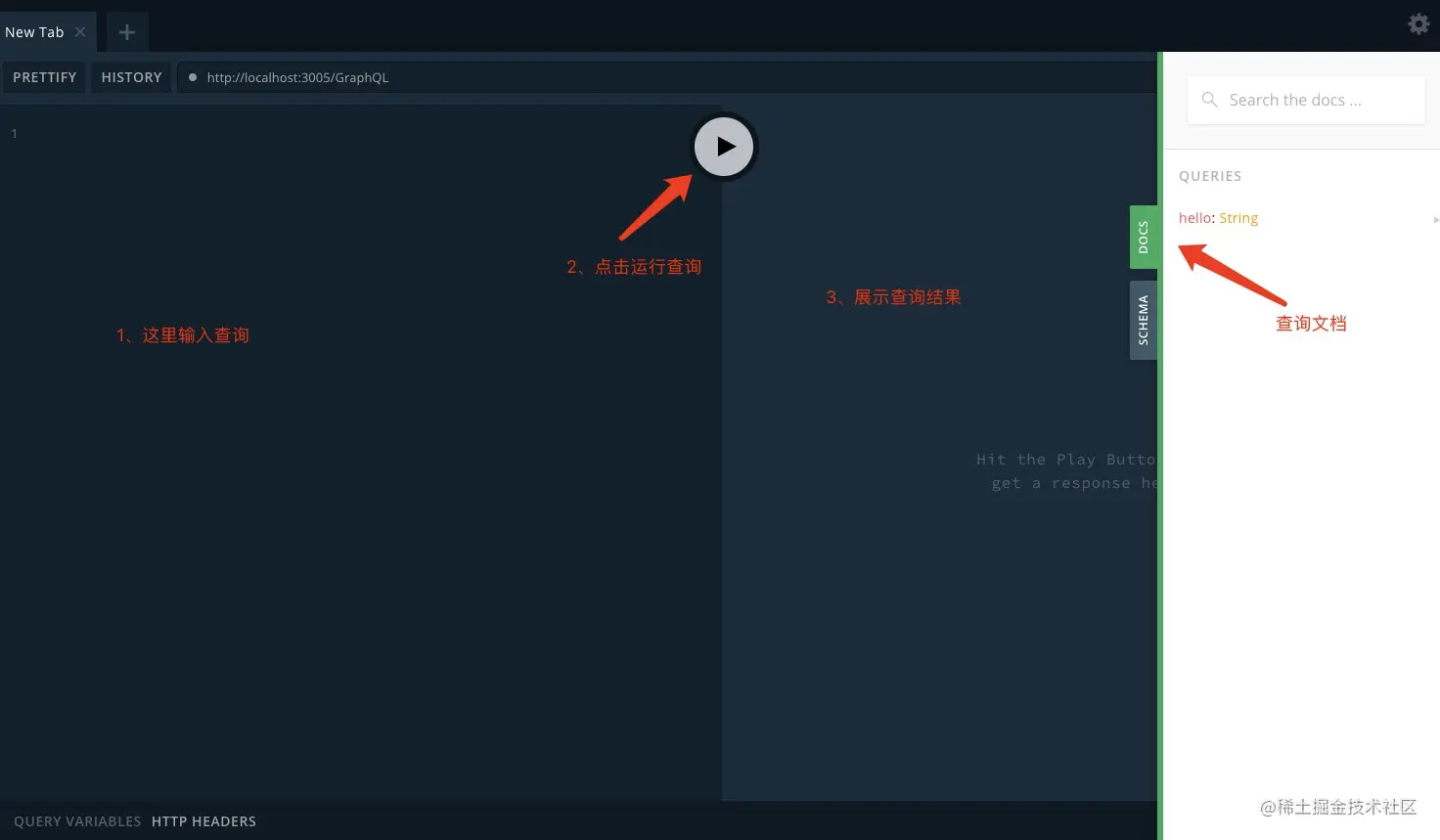 按照上面的图的步骤,录入定义的查询{hello},运行结果如下: