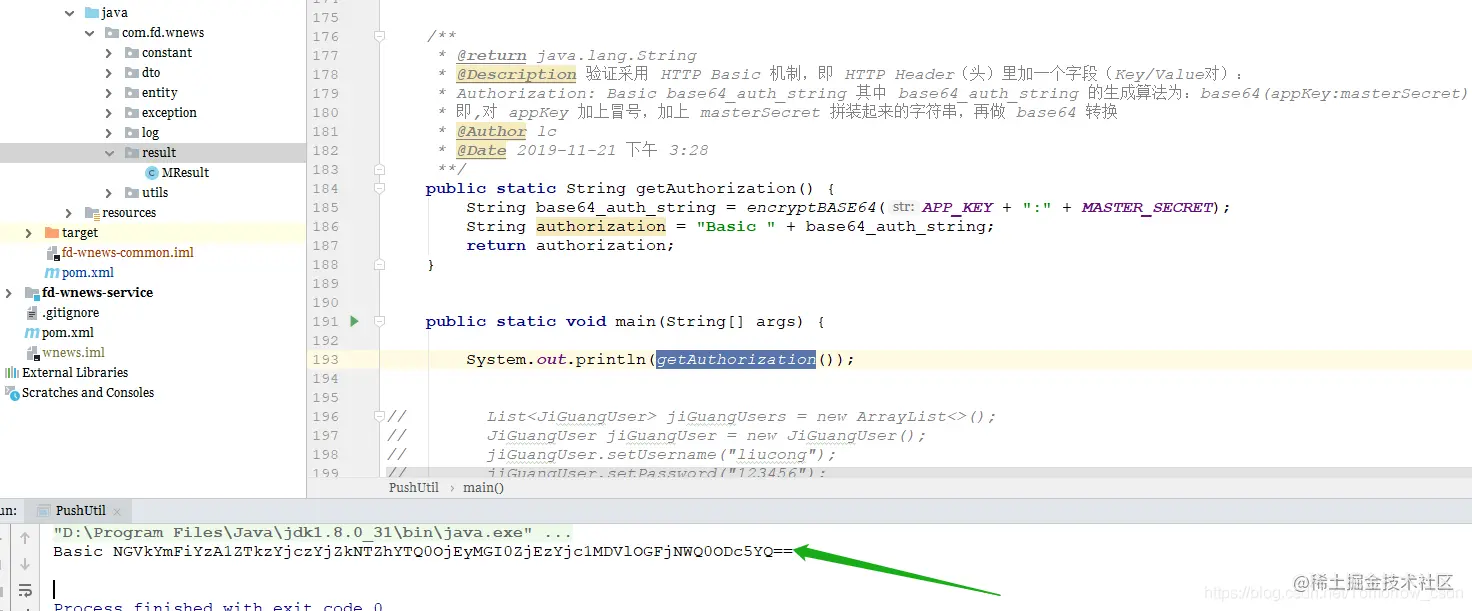 * 即,对 appKey 加上冒号,加上 masterSecret 拼装起来的字符串,再做 base64 转换