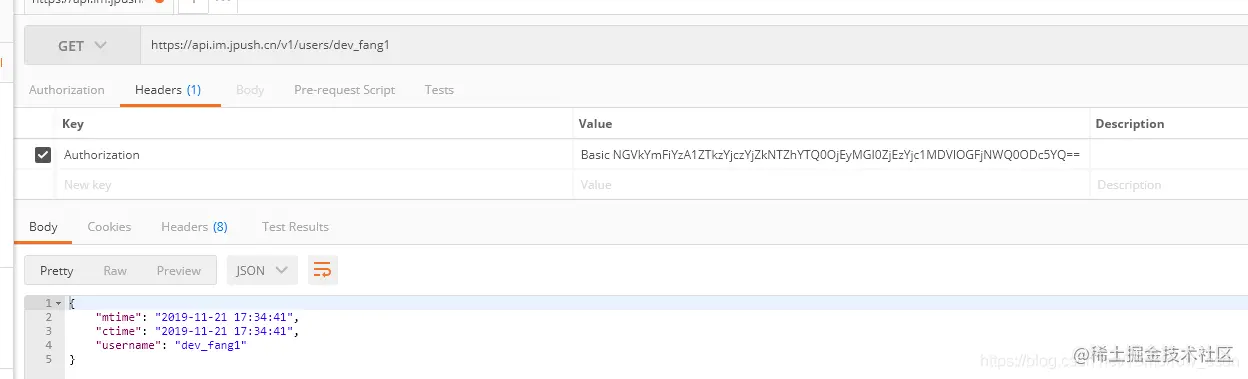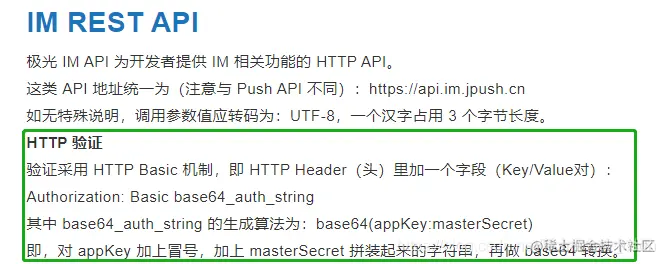 * Authorization: Basic base64_auth_string 其中 base64_auth_string 的生成算法为:base64(appKey:masterSecret)