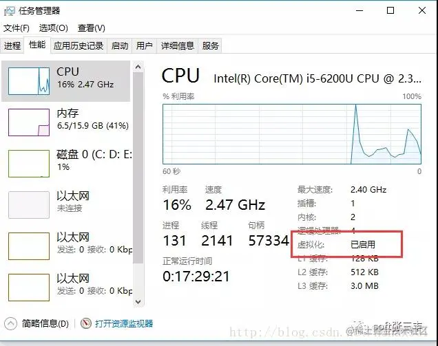 3. 开启虚拟化重启后,进入任务管理器看虚拟化是否已启用。