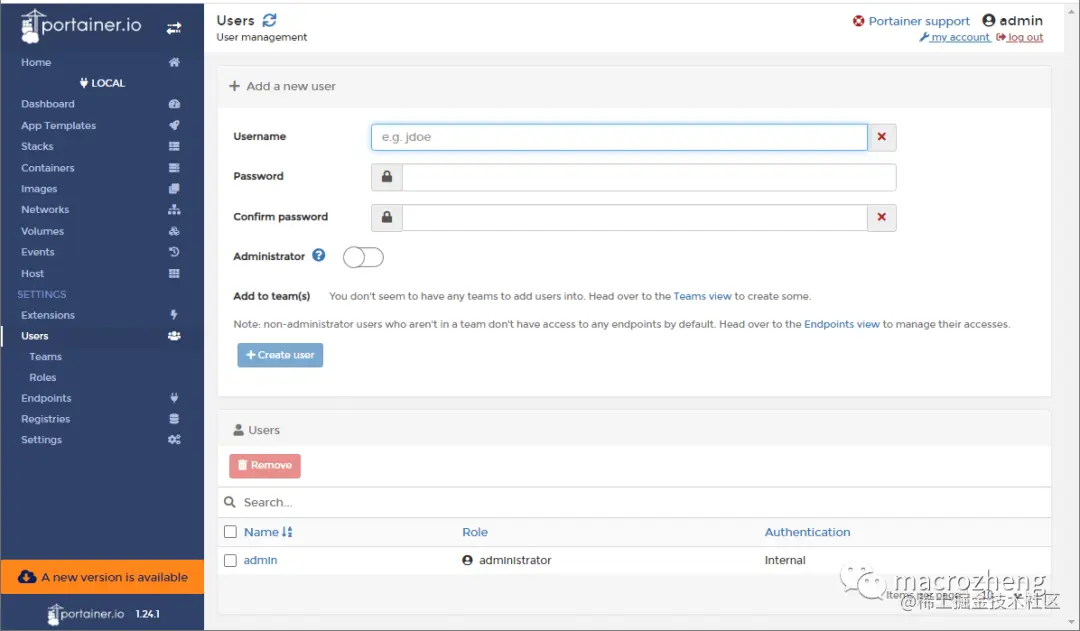 - 打开Users菜单,我们可以创建Portainer的用户,并给他们赋予相应的角色;
