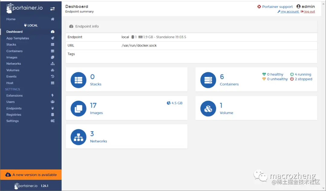 - 打开Dashboard菜单可以看到Docker环境的概览信息,比如运行了几个容器,有多少个镜像等;