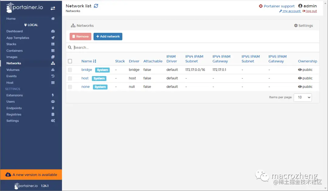 - 打开Networks菜单,可以查看Docker环境中的网络情况;