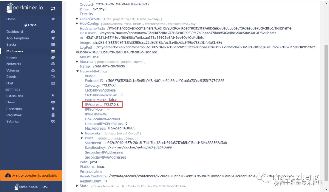 - 点击Inspect按钮,可以查看容器信息,比如看看容器运行的IP地址;