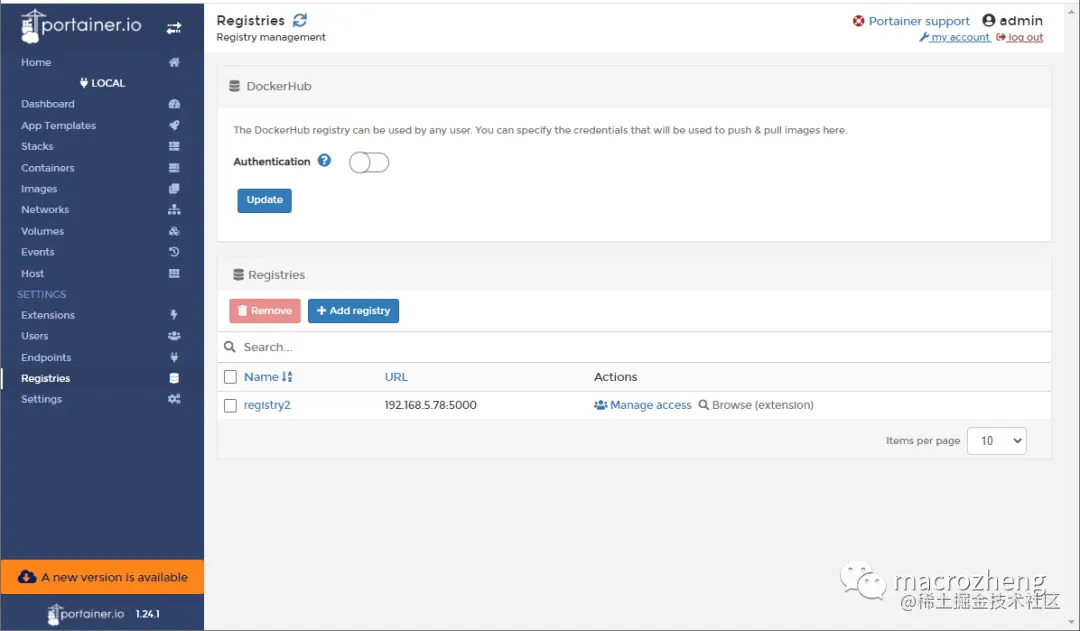 Portainer作为一款轻量级Docker图形化管理工具,功能强大且实用,要是有个私有镜像仓库管理功能就更好了,这样我们就不用安装重量级的镜像仓库Harbor了。
