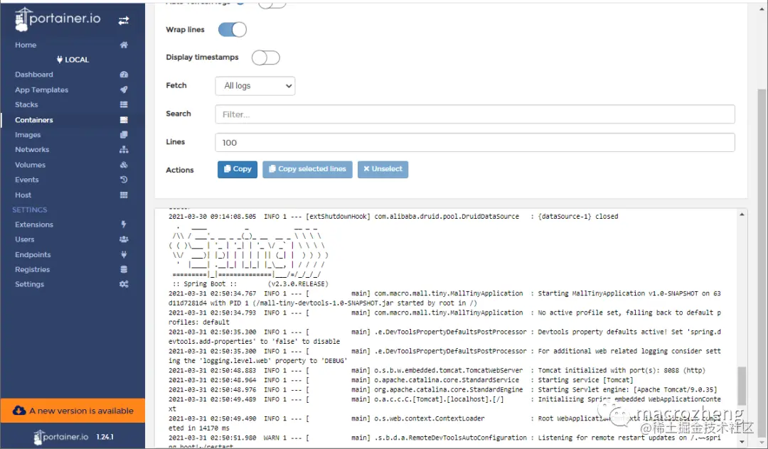 - 选择一个容器,点击Logs按钮,可以直接查看容器运行日志,可以和