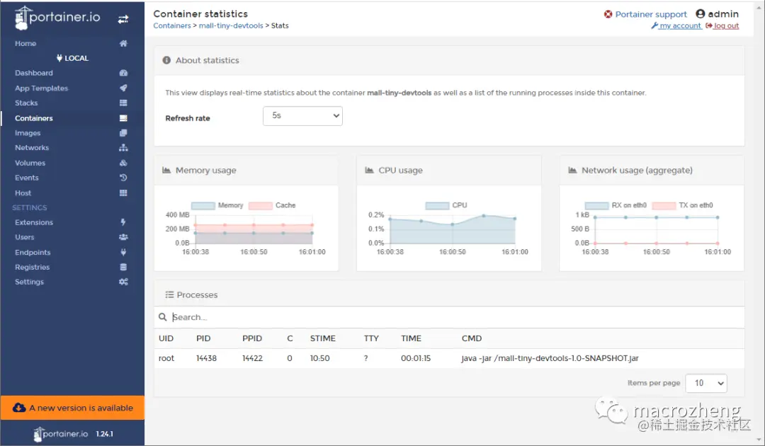 - 点击Stats按钮,可以查看容器的内存、CPU及网络的使用情况,性能分析不愁了;