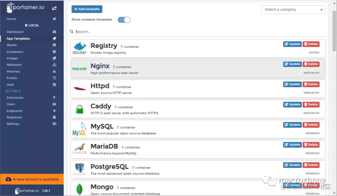 - 打开App Templates菜单可以看到很多创建容器的模板,通过模板设置下即可轻松创建容器,支持的应用还是挺多的;