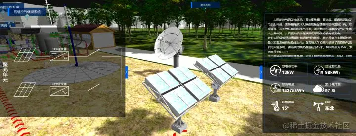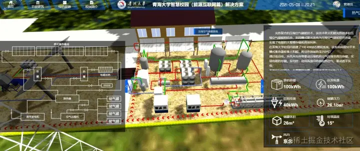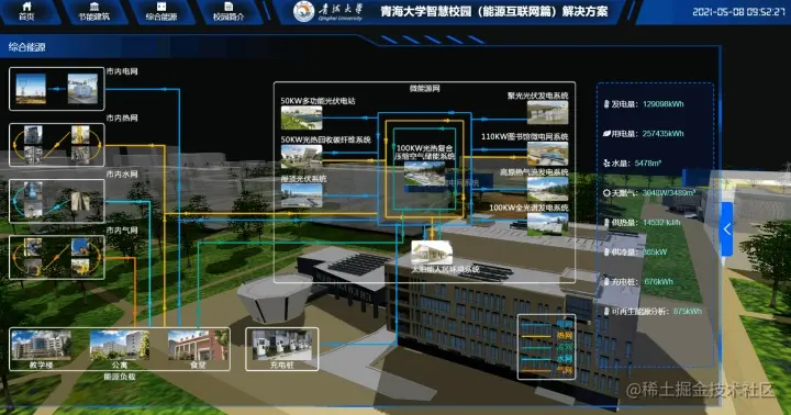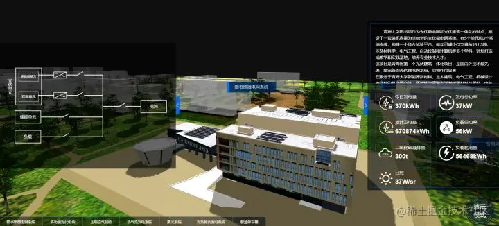 青海大学联合清华大学建成了以太阳能高效综合利用为特点的智慧微能源网试验系统。以下是青海大学在ThingJS平台基于 HTML5和 WebGL技术实现的青海大学智慧微能源课题在ThingJS开发的数字孪生可视化系统,直观的展现出智慧微能源系统的运行状态。