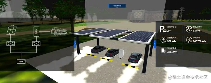 右侧面板显示当前停车位、发电总功率、当日发电量、总发电量、充电桩电量等状态信息。