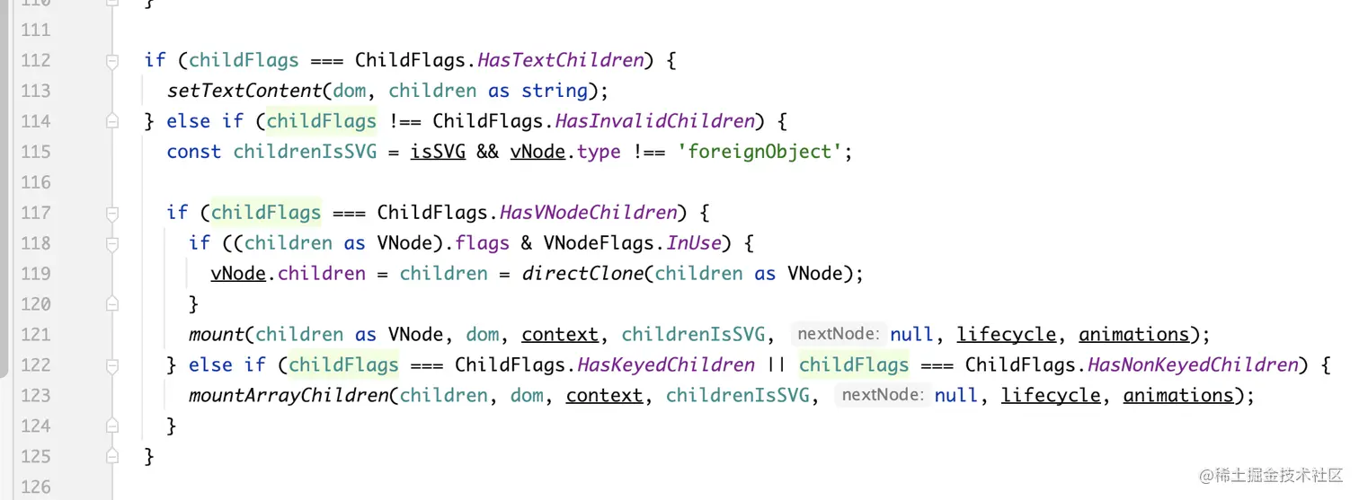 在patchChildren的时候,会根据新旧vnode的childFlags执行不同的patch逻辑,后面会提到