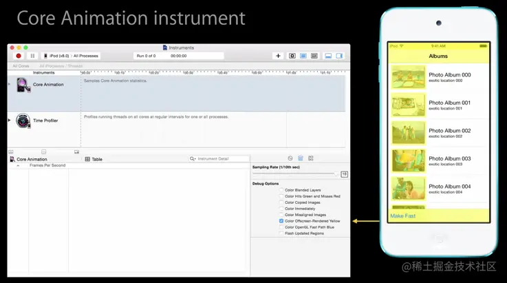 使用instruments的CoreAnimation工具来检查离屏渲染,黄色是我们不希望看到的颜色。
