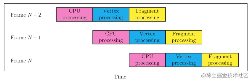 由于每一帧的顶点和像素处理相对独立,iOS会将CPU处理,顶点处理,像素处理安排在相邻的三帧中。如图,当一个渲染命令提交后,要在当帧之后的第三帧,渲染结果才会显示出来。