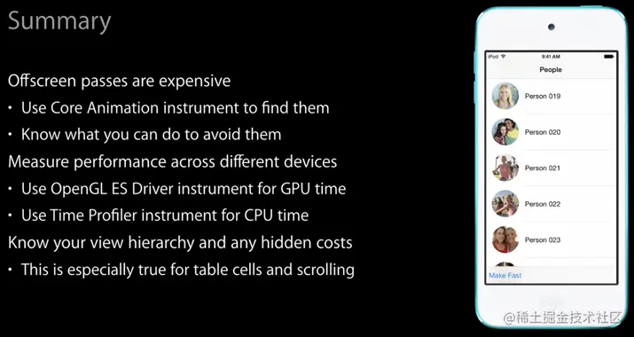 由于WWDC视频内容较久,里面仍在使用OpenGL ES(这部分现在已经由Metal替代),但是这并不影响我们对整个移动端的视图渲染过程进行学习。