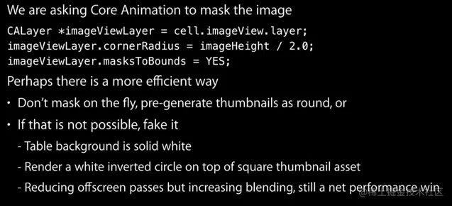 不要使用不必要的mask,可以预处理图片为圆形;或者添加中间为圆形透明的白色背景视图。即使添加额外的视图,会导致额外的计算;但仍然会快一点,因为相对于切换上下文,GPU更擅长渲染。