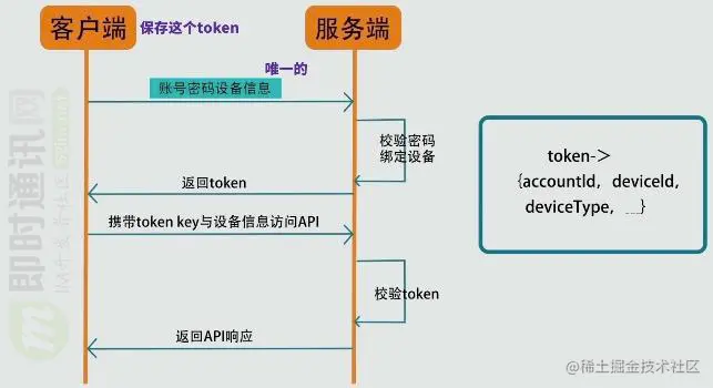 - 1)客户端得到这个token后,需要进行一个本地保存,每次访问系统API都携带上token与设备信息;