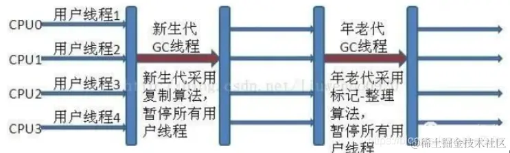 - Serial(英文连续)是最基本垃圾收集器,使用复制算法,曾经是JDK1.3.1之前新生代唯一的垃圾收集器。Serial 是一个单线程的收集器,它不但只会使用一个 CPU 或一条线程去完成垃圾收集工作,并且在进行垃圾收集的同时,必须暂停其他所有的工作线程,直到垃圾收集结束。Serial 垃圾收集器虽然在收集垃圾过程中需要暂停所有其他的工作线程,但是它简单高效,对于限定单个 CPU 环境来说,没有线程交互的开销,可以获得最高的单线程垃圾收集效率,因此 Serial垃圾收集器依然是 java 虚拟机运行在 Client 模式下默认的新生代垃圾收集器。