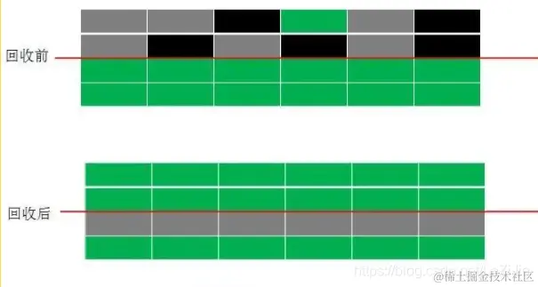 从图中我们就可以发现,该算法最大的问题是内存碎片化严重,后续可能发生大对象不能找到可利用空间的问题。