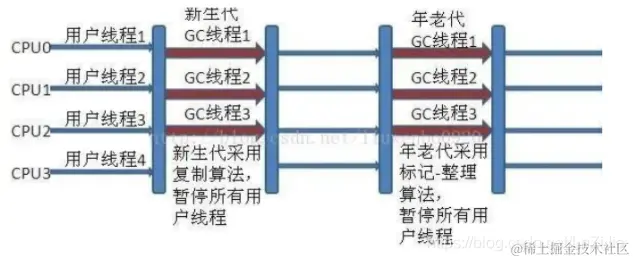 - ParNew 垃圾收集器其实是 Serial 收集器的多线程版本,也使用复制算法,除了使用多线程进行垃圾收集之外,其余的行为和 Serial 收集器完全一样,ParNew 垃圾收集器在垃圾收集过程中同样也要暂停所有其他的工作线程。ParNew 收集器默认开启和 CPU 数目相同的线程数,可以通过-XX:ParallelGCThreads 参数来限制垃圾收集器的线程数。【Parallel:平行的】ParNew虽然是除了多线程外和Serial收集器几乎完全一样,但是ParNew垃圾收集器是很多java虚拟机运行在 Server 模式下新生代的默认垃圾收集器。