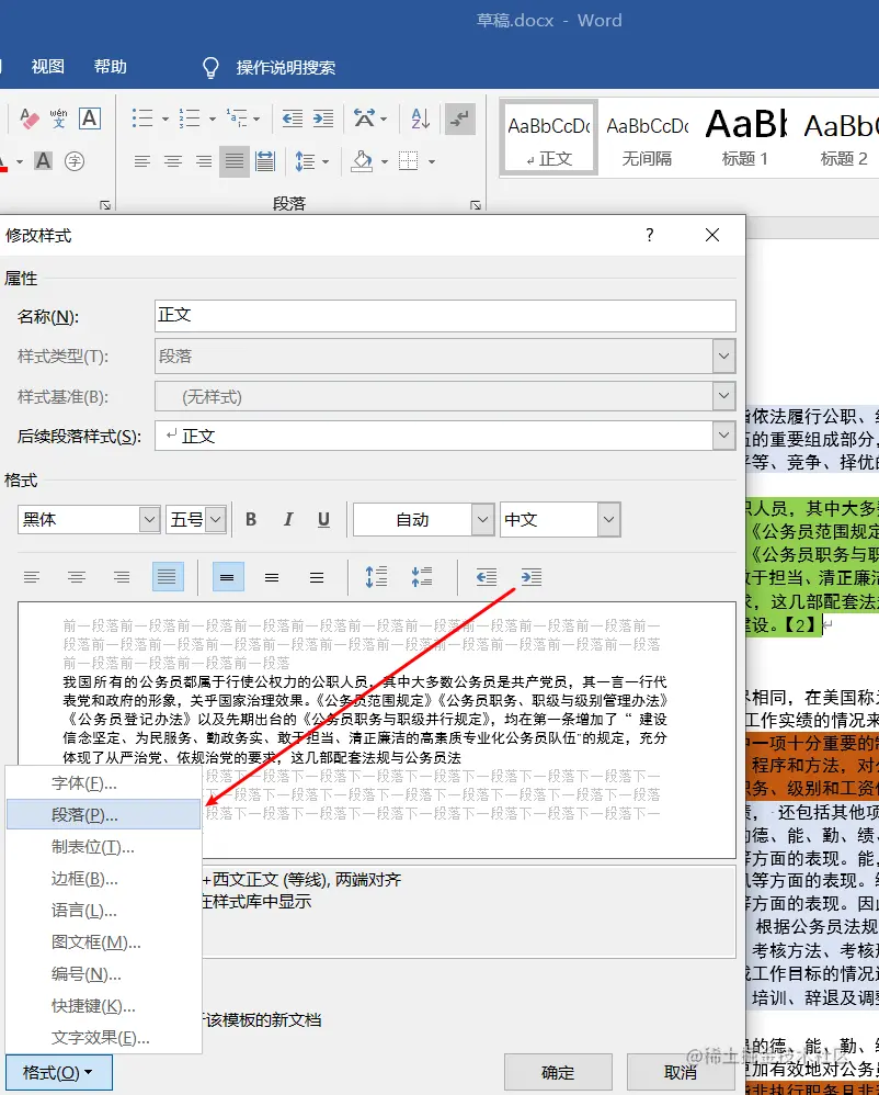 可以看到,这篇论文一点格式都没有加。第一步就是按照学校格式的要求为文本添加一个全局的样式(正文、一级标题、二级标题、等等都在此处设置好),具体设置方式右击箭头所指的位置即可设置字体样式,点击箭头所指的段落可以设置间距、对齐方式、缩进等等,标题的设置类似。
