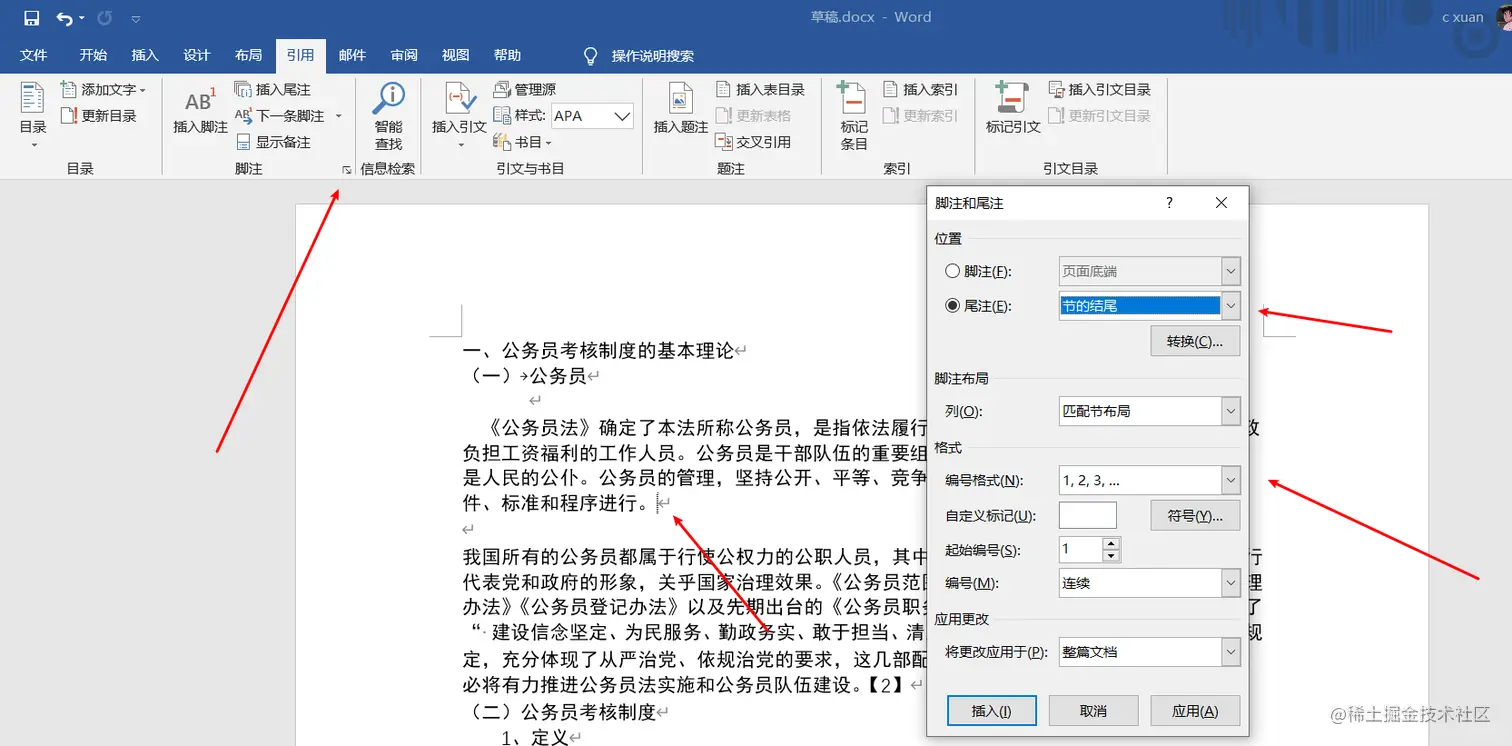 2.插入之后会在当前位置和文末生成尾注,修改默认的尾注样式;
