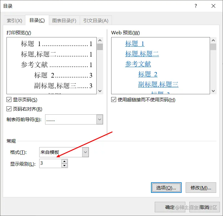 此处要设置一个显示级别,表示目录中最多所引导几级标题。