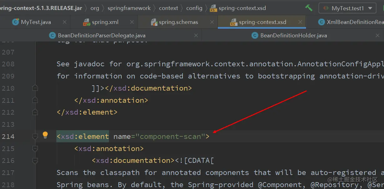 在这个本地的xsd文件中,我们可以看到component-scan标签: