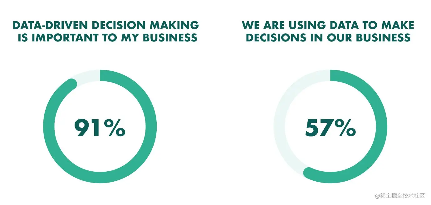 虽然91%的公司表示数据驱动的决策对他们的业务增长很重要,但是只有57%的公司表示他们的业务决策基于数据。